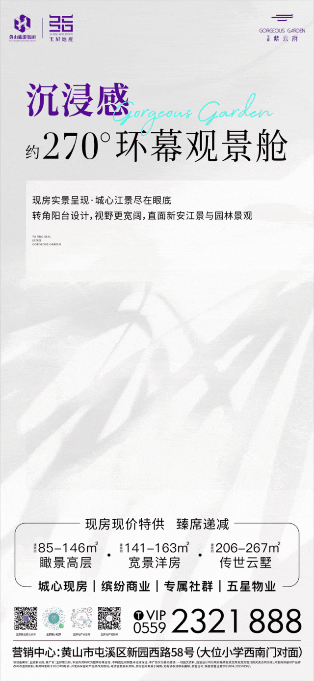沉浸感,玉屏紫云府现房实景呈现,约270°环幕观景舱,城心江景尽在眼底,转角阳台设计,视野更宽阔,直面新安江景与园林景观。