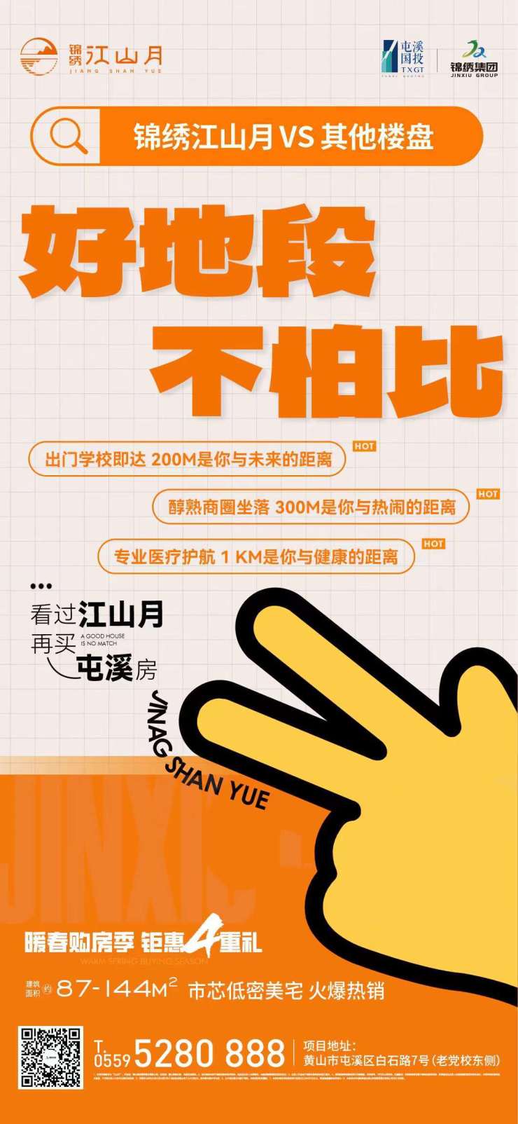 好地段,不怕比,锦绣江山月出门学校即达,200M是你与未来的距离;醇熟商圈坐落,300M是你与热闹的距离;专业医疗护航,1KM是你与健康的距离。暖春购房,钜惠四重好礼:来访礼,来访送好礼;认购礼,暖春认购优惠放肆享;签约礼 ,按时签约即享砸金蛋赢家电;安家礼,春日特惠房源限时抢。建面约87-144㎡市芯低密美宅热售中,均价12500元/㎡。