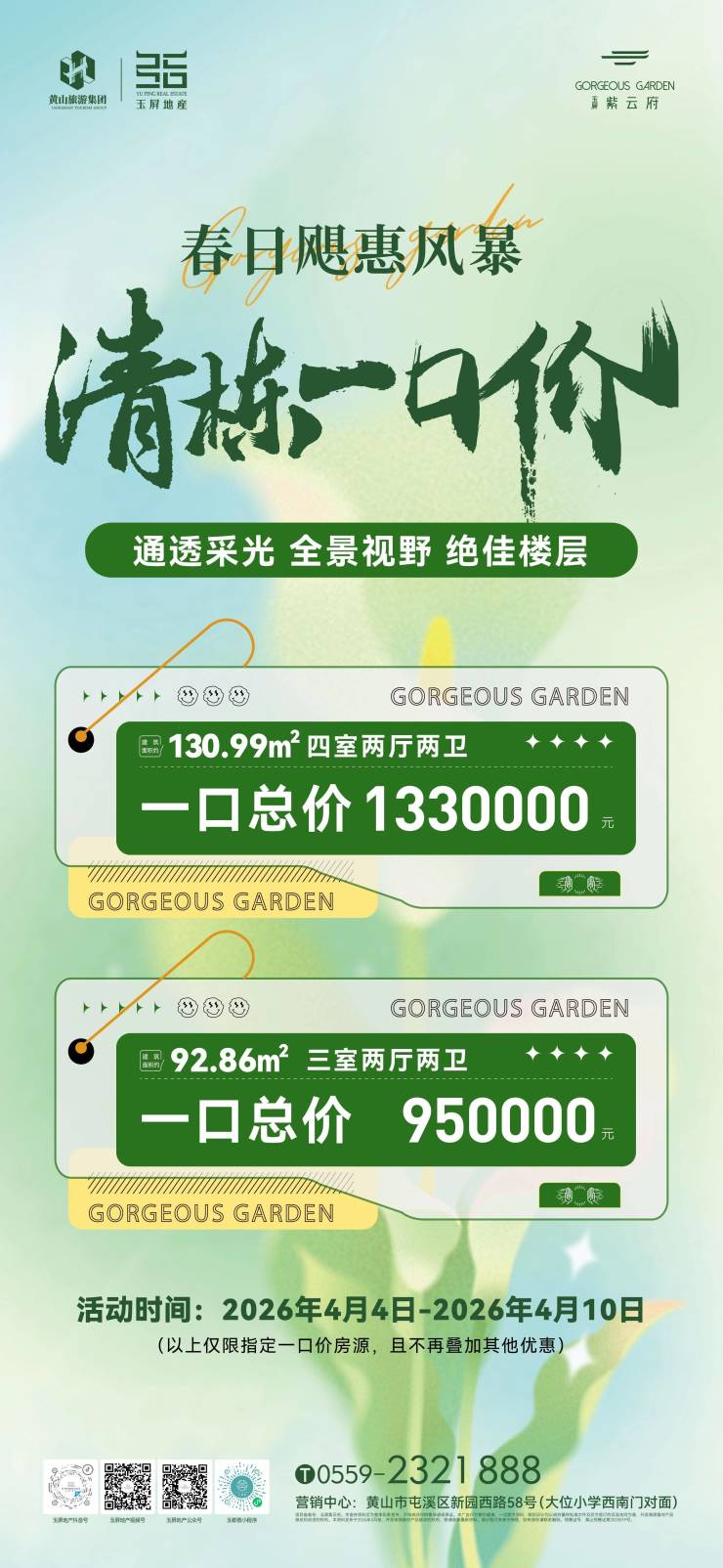 春日飓惠风暴,清栋一口价。玉屏紫云府11#楼清栋钜惠,通透采光,全景视野,绝佳楼层,一口价限时秒杀。活动时间:截止至4月10日。