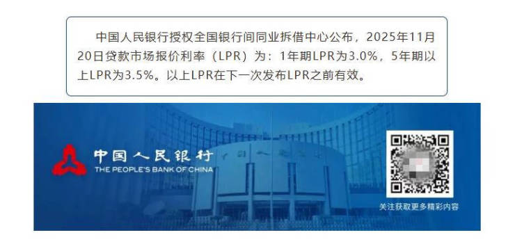 中国人民银行授权全国银行间同业拆借中心公布,2025年11月20日贷款市场报价利率(LPR)为:1年期LPR为3.0%,5年期以上LPR为3.5%。以上LPR在下一次发布LPR之前有效。