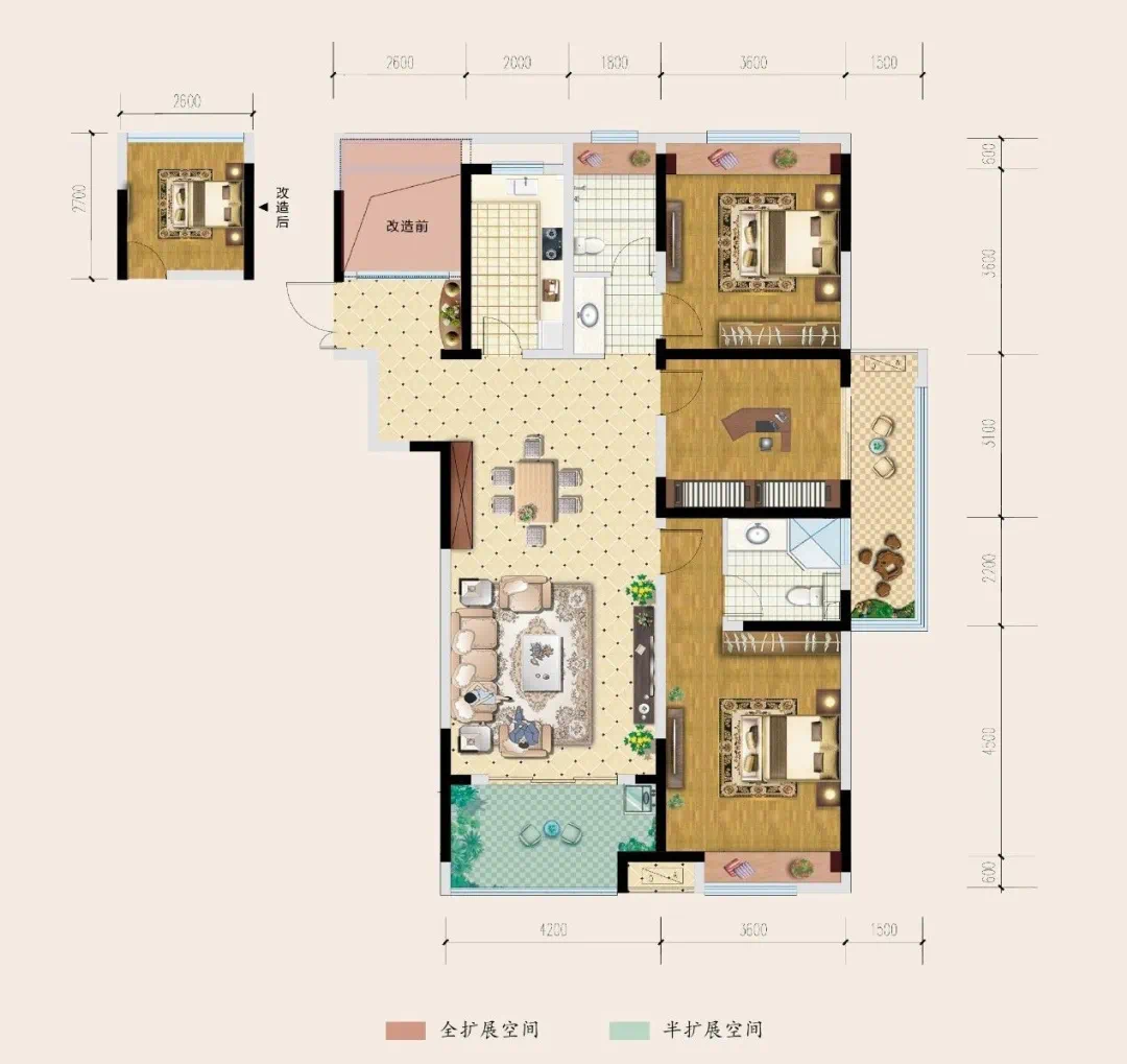 客厅4.2m大开间设计,大气敞亮随意打造,休闲、生活游刃有余;卧室3.6m大开间设计,避免居住的拥挤,大气通透、方正实用,宽敞主卧配备飘窗,观景阳台尺度开阔,餐客厅一体设计,兼顾功能性和舒适性,可以满足不同年龄段家庭成员的空间需求。