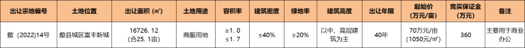 歙县城区富丰新城1宗商服用地挂牌,出让面积25.1亩