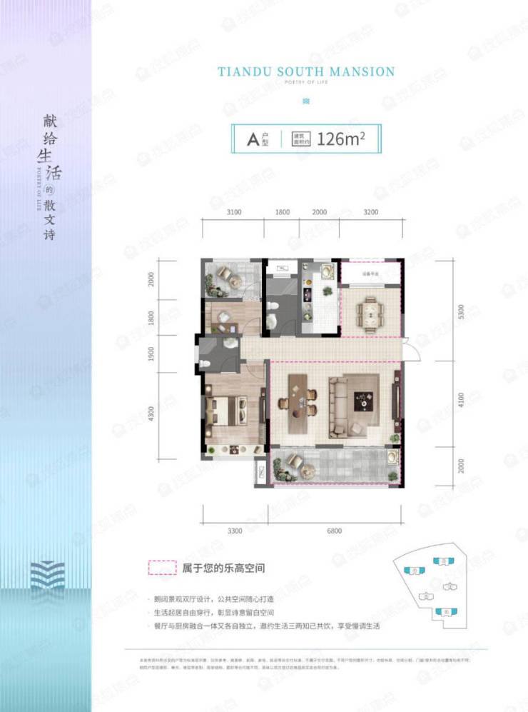 105㎡户型,格局方正,三开间朝南,配备有6.7米开间观景阳台;主卧进深达8.3米,南北贯通,空间通透明亮,可拓展性高,随心改造。120㎡户型,朗阔双厅设计,随意切换生活模式;12.6米大面宽朝南,客厅、餐厅与阳台相连,空间通透,采光充足;配备双卫,方便生活,保障私密空间。