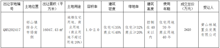 2025年1月17日,祁门县QMX202417号地块成功出让,由黄山林城置业发展有限公司底价竞得。宗地位于祁山镇综合大市场南侧,成交面积为16047.43㎡(合24.07亩),成交总价为2410万元,成交楼面地价为750.9元/㎡。