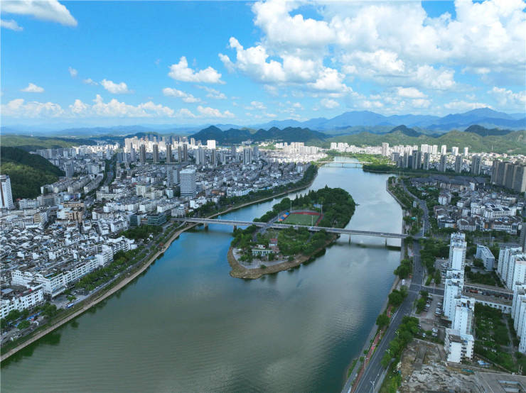 从高空视角,我们可以看到锦绣江山月与新安江咫尺距离,高层还能看到江景的变化。