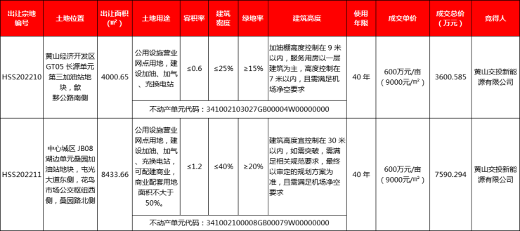 2022年12月7日下午,黄山中心城区GT05长源单元第三加油站地块、JB08湖边单元桑园加油站地块2宗公用设施营业网点用地成交,由黄山交投新能源有限公司底价竞得。其中,