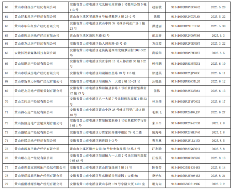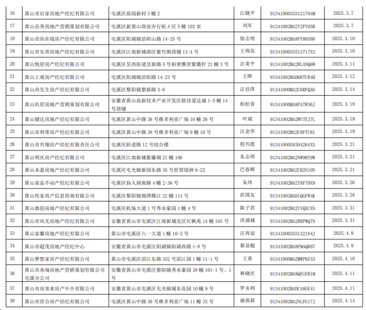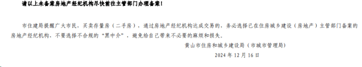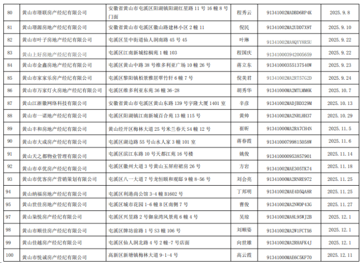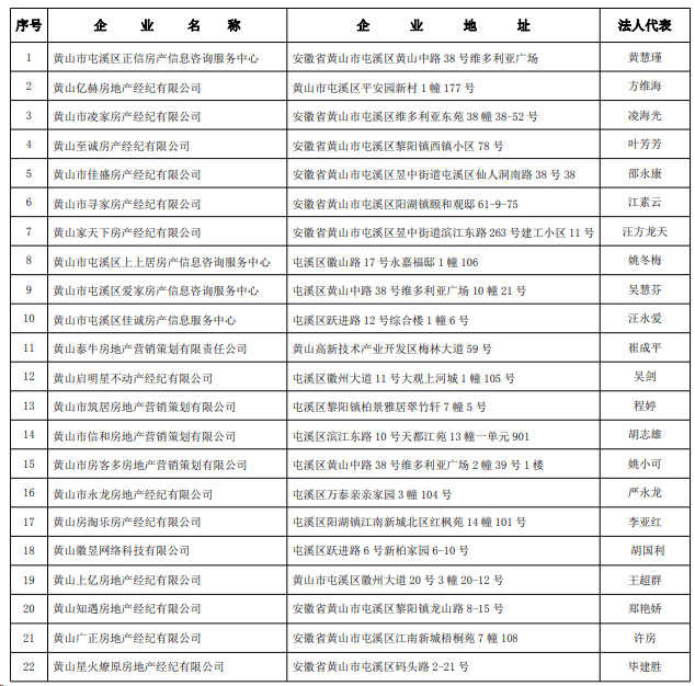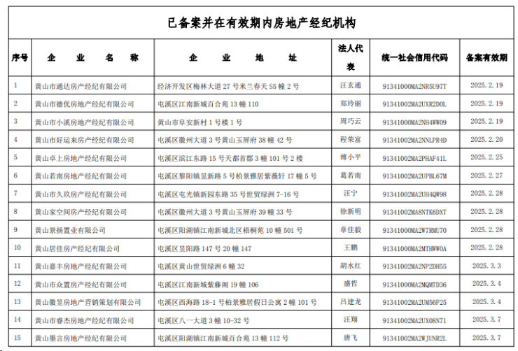 截至2024年12月15日,黄山市中心城区已备案并在有效期内的房地产经纪机构100家,未备案房地产经纪机构28家,现将具体情况公示。如下: