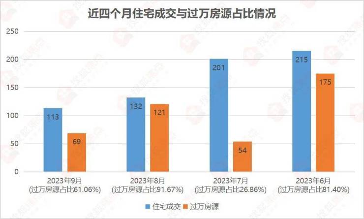 2023年9月普通住宅成交113套,其中过万房源成交69套,占比约61.06%。普通住宅成交均价11200元/㎡,对比上月的12000元/㎡,下降800元/㎡。