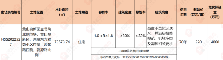 2025年8月,黄山高新区壹号院北侧住宅地块(宗地编号:HSS202527)挂牌,宗地位于黄山高新区,鸿威东方雅苑小区东侧,源东路西侧、婺源路北侧。出让总面积73573.74㎡(合110.36亩),起始总价24279.3342万元,起始单价3300元/㎡(220万元/亩),容积率1.0<R≤1.8,起拍楼面地价1833.33元/㎡。地块要求不得建筑私家庄园和别墅。