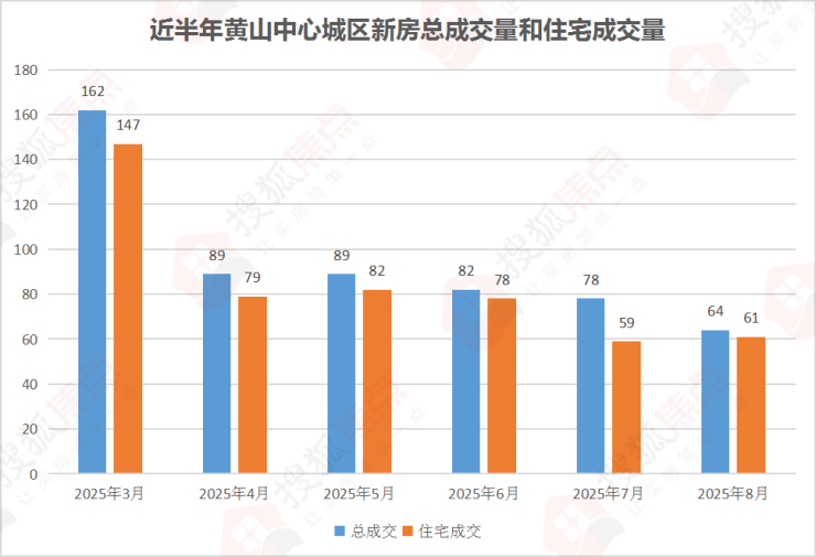 2025年8月黄山中心城区新房共成交64套,环比7月的78套,减少14套,下降17.95%;同比去年8月的58套,增加6套,上涨10.34%。