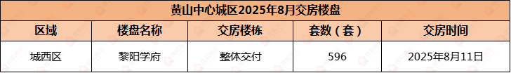 2025年8月,黄山中心城区黎阳学府交付,共计596套房源。