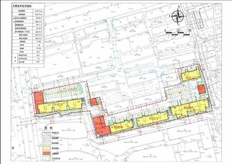 新跃小区位于跃进路与新园西路交叉口东南侧,小区内老1#楼、新1#楼、18-20#楼、会堂、22-24#楼建设于上世纪七八十年代,楼栋外观破旧,环境较差,且经鉴定部分为危房。为改善居民居住条件,同时考虑东侧地块开发建设等因素,屯溪区政府拟对该区域拆旧建新(含原屯溪区染织厂宿舍已拆除区域),用地面积8135.75平方米,主要规划建设五栋住宅(2#、4#、6#楼为4层,1#楼为7-8层、3#楼为8层)及一处3层社区服务用房,沿跃进路设置局部商业,规划总建筑面积17052.9平方米,其中计容建筑面积为15019平方米,不计容建筑面积为2033.9平方米,配建地面机动车停车位103个,非机动车位结合地下储藏间设置。因用地范围限制,新建建筑退西侧用地界线最小值1.4米,退东侧用地界线最小值2.2米,退南侧用地界线最小值0.4米。项目日照分析满足《城市居住区规划设计标准》(GB 50180-2018)及《黄山市城市控制性详细规划通则》相关要求。根据有关规定,现将总平图、效果图及日照分析图予以公示,如有意见和建议,请在公示期内向我局反馈。