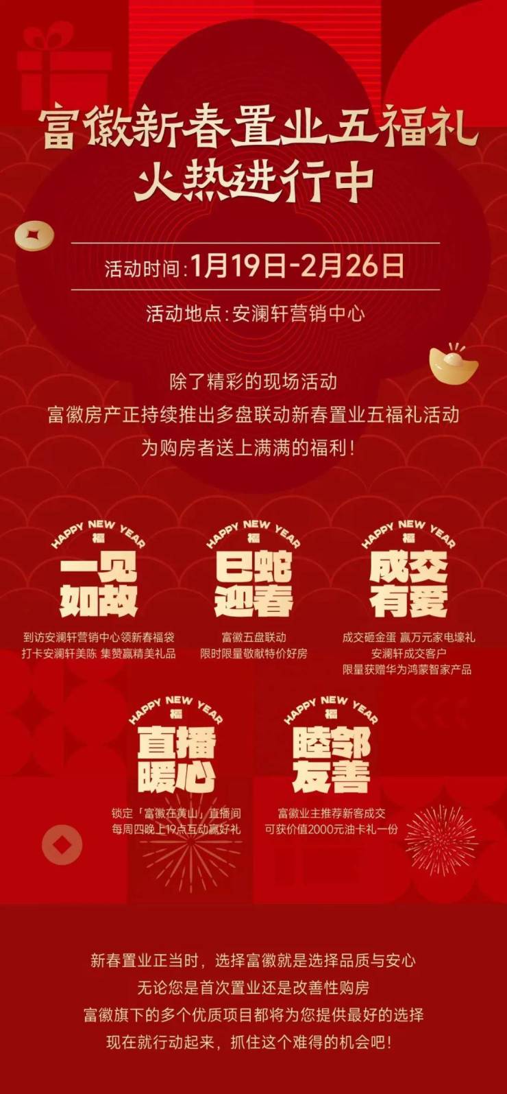 展会期间:推出10套85折优惠的特价房、一口价房源3套、双倍老带新、1号楼“荣归故里,36席加推、业主加购新春礼、成交可享“福禄”好礼相送。