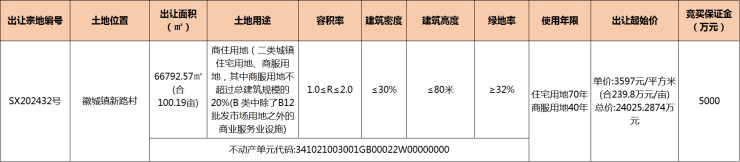 2024年11月20日,歙县1宗商住用地(宗地编号:SX202432号)挂牌,宗地位于徽城镇新路村,出让面积66792.57㎡(合100.19亩),起始总价24025.2874万元,起拍单价3597元/㎡(合239.8万元/亩) ,起拍楼面地价1798.5元/㎡,容积率为1.0≤R≤2.0,其中商服用地可兼容商务服务设施(除批发市场用地)不超过总建筑规模的20%,拍卖时间:2024年12月19日上午10时。