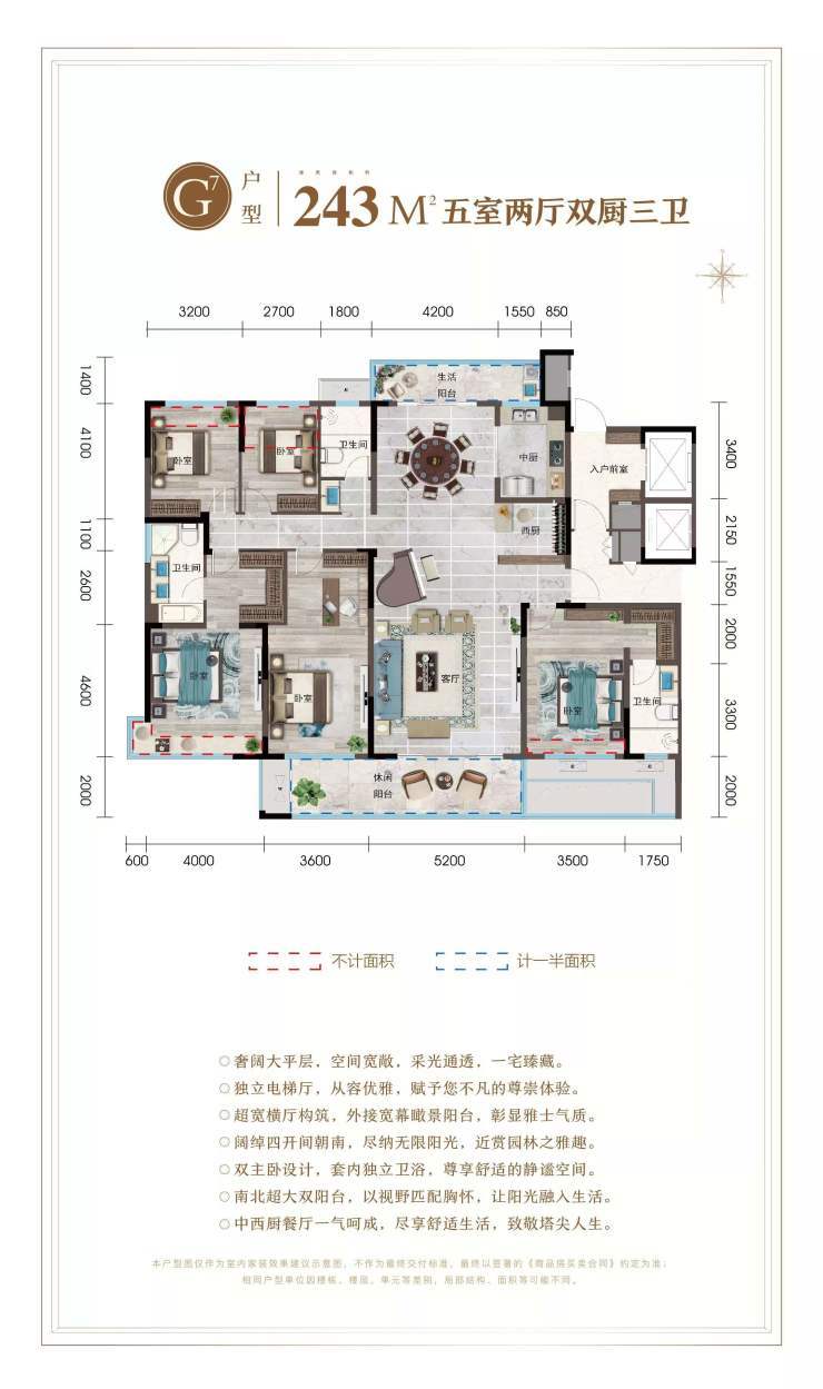 紫阳兰亭243㎡大平层,一梯一户,尽享私密;户型层高3.1米,南向面宽超18米,相对于传统户型的室内动线设计,243㎡的大平层户型更注重室内场景的营造,四开间朝南,南向面宽超18米,奢阔客厅+长14米、宽2米的巨幕阳台,优质采光,空间通透,无论朋友聚会或商务会谈,都恰到好处。
