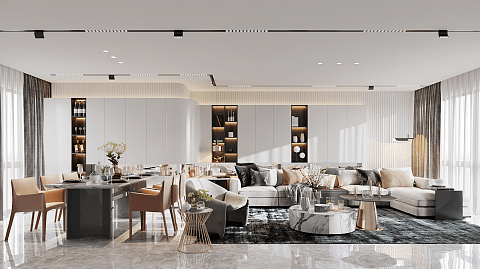 建筑面积约155㎡的下叠,户型更是出彩。从南向庭院独立入户,进门之后就是大横厅,餐客厨一体的空间,很开阔,足以容纳一个大家族的节日聚餐或是一场精致的下午茶party。