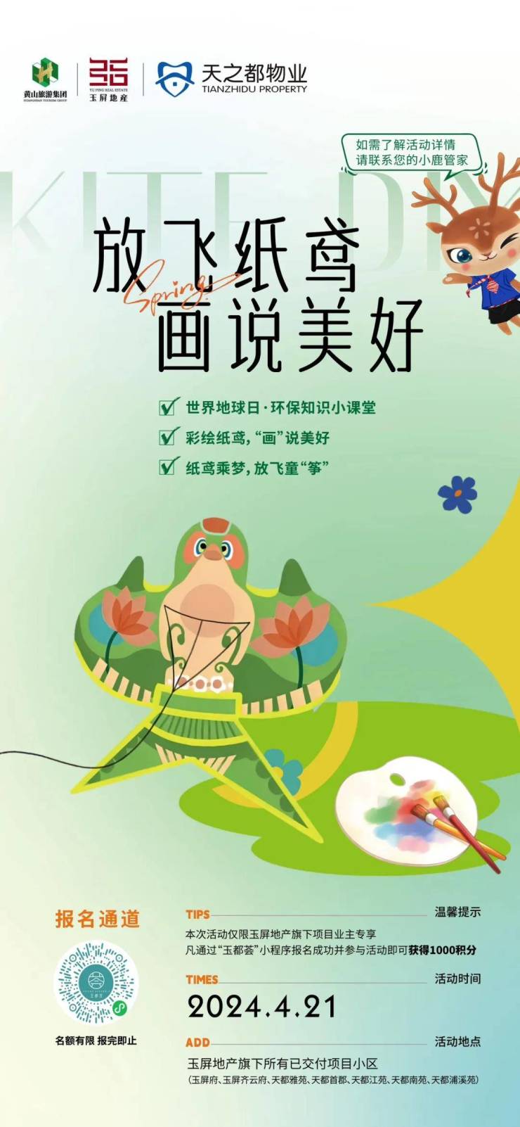 玉屏地产&天之都物业联动“放飞纸鸢,画说美好!”活动;活动内容:世界地球日环保知识小课堂、彩绘纸鸢“画”说美好、纸鸢乘梦放飞童“筝”。活动时间:2024.4.21,名额有限,报完即止。活动地点:玉屏地产旗下所有已交付项目小区(玉屏府、玉屏齐云府、天都雅苑、天都首郡、天都江苑、天都南苑、天都浦溪苑)。