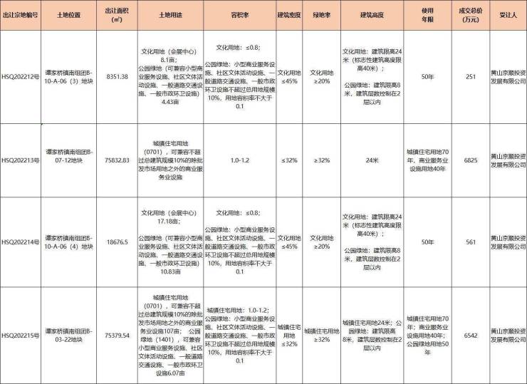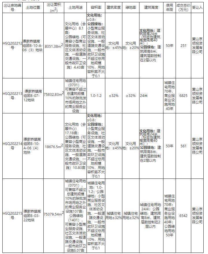 2022年11月18日,黄山京顺投资发展有限公司成功竞得黄山区谭家桥镇南组团2宗商住、2宗文化用地, 成交总价14179万元。其中,HSQ202213号地块、HSQ202215号地块为商住用地,合计151212.37㎡(226.818555亩),容积率1.0-1.2;HSQ202212号、HSQ202214号为文化用地,合计27027.88㎡(40.54182亩)。