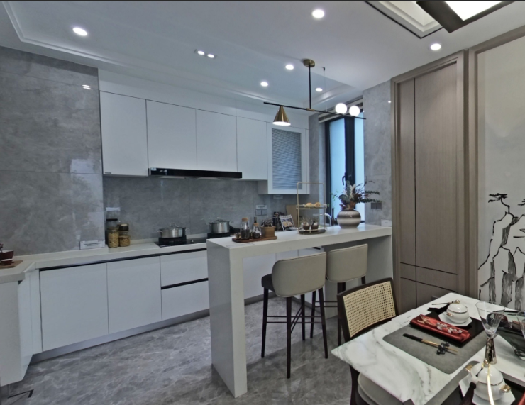U型开阔式厨房动线非常流畅,可以满足主人的厨艺发挥;客厅与餐厅各分天下,全家人就餐其乐融融,就着惬意的私家花园风景,沉浸于共享美景美食的幸福时光。