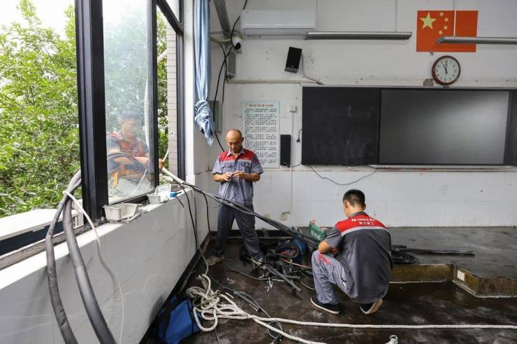 8月11日,在屯溪现代实验学校和屯溪六中的校园内,空调安装及电力改造工作正有序开展,工人们争分夺秒,确保在新学期为师生们送上“清凉”。