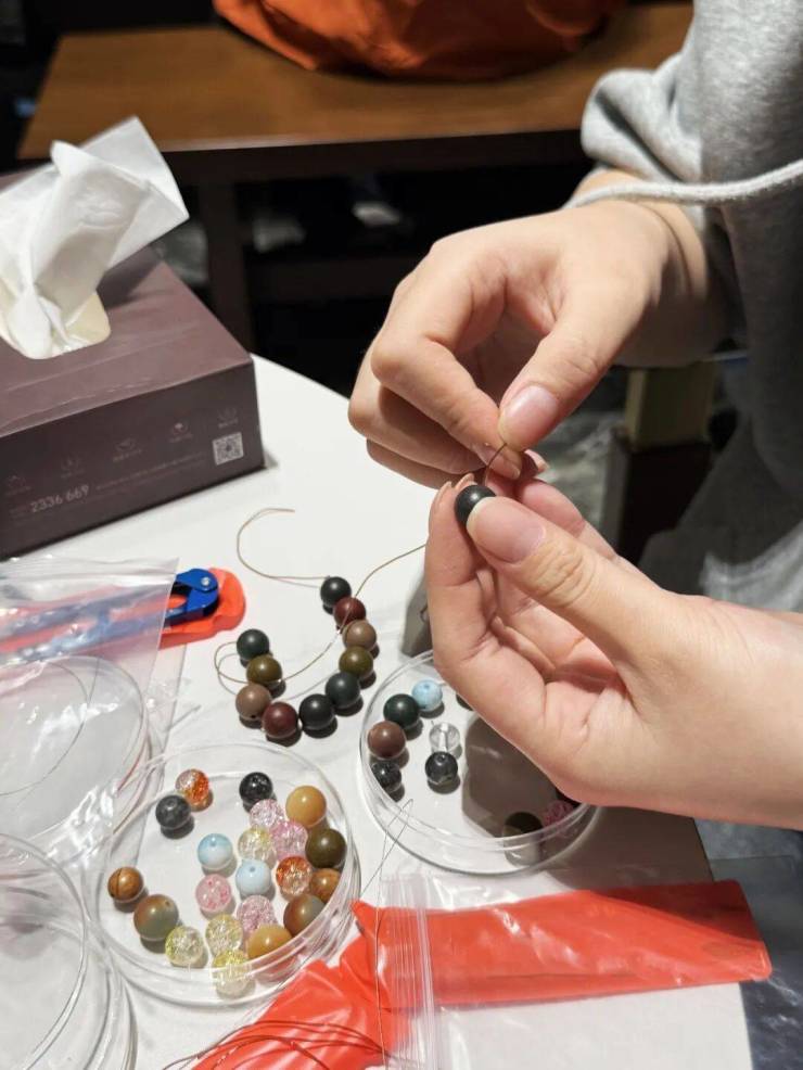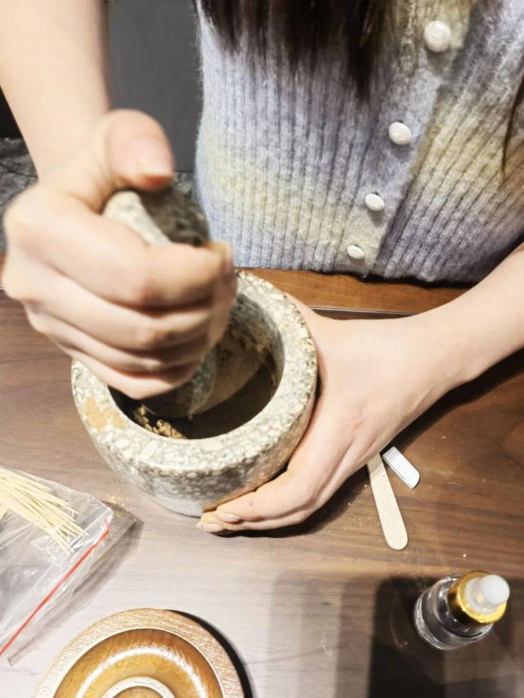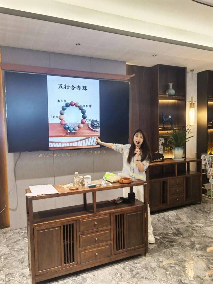 活动在氤氲的药香中拉开帷幕。在“中药古法制珠手串DIY”环节,大家于沉香、艾草、陈皮的天然气息里,寻得一份手作的宁静。在专业老师的悉心指导下,各位家人精心挑选心仪的本草,细心穿制,将健康祝福编织进每一颗珠子里。腕间一抹独特的秋日风景,不仅雅致,更成为时刻相伴的“健康护身符”。