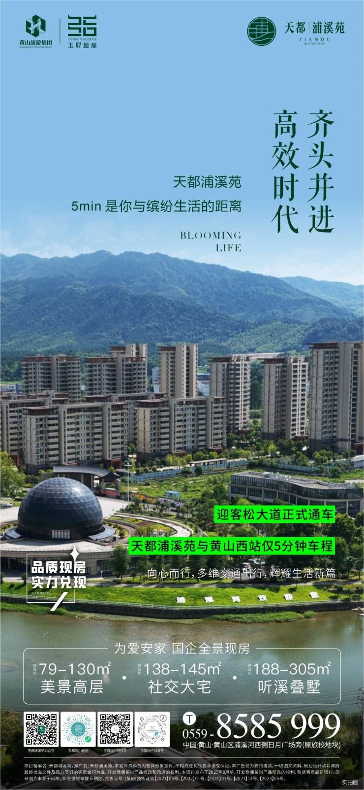 为爱安家 国企全景现房。天都浦溪苑建面约79 - 130㎡的美景高层,138 - 145㎡社交大宅,188 - 305㎡听溪叠墅热售中。