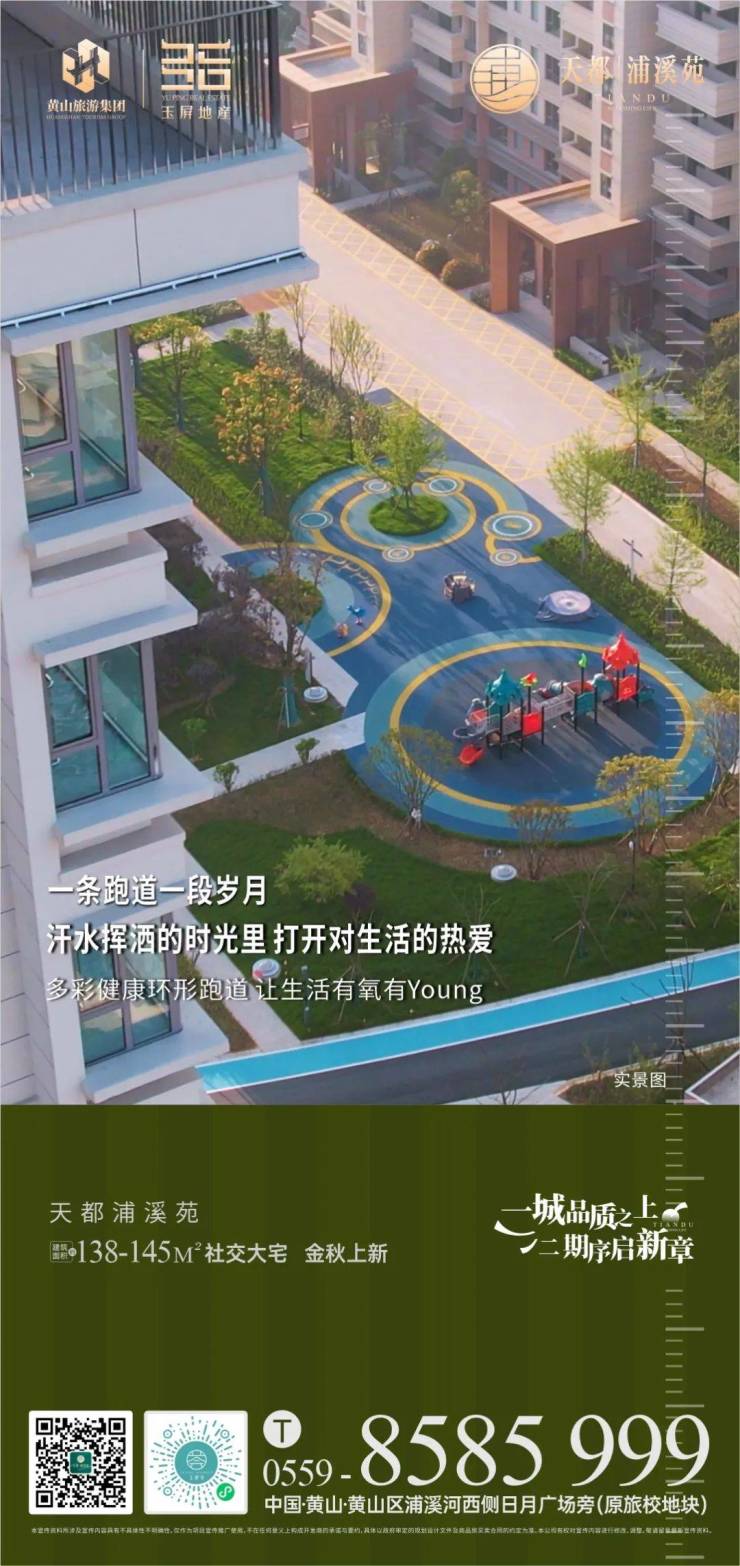 天都浦溪苑,一条跑道一段岁月,汗水挥洒的时光里打开对生活的热爱,多彩健康环形跑道让生活有氧有Young。一城品质之上,二期序启新章!天都浦溪苑,138-145㎡社交大宅金秋上新。…