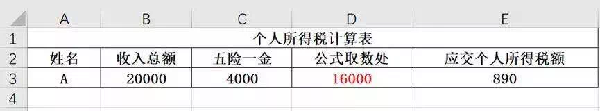 用A个人收入20000元,再减去五险一金4000元,求得16000元,填写在表格D3处:
