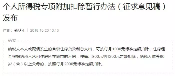 10月20日,《个人所得税专项附加扣除暂行办法(征求意见稿)》新鲜出炉。征求意见将有15天时间,再经过修改完善,提交国务院讨论,于明年1月1日实施。