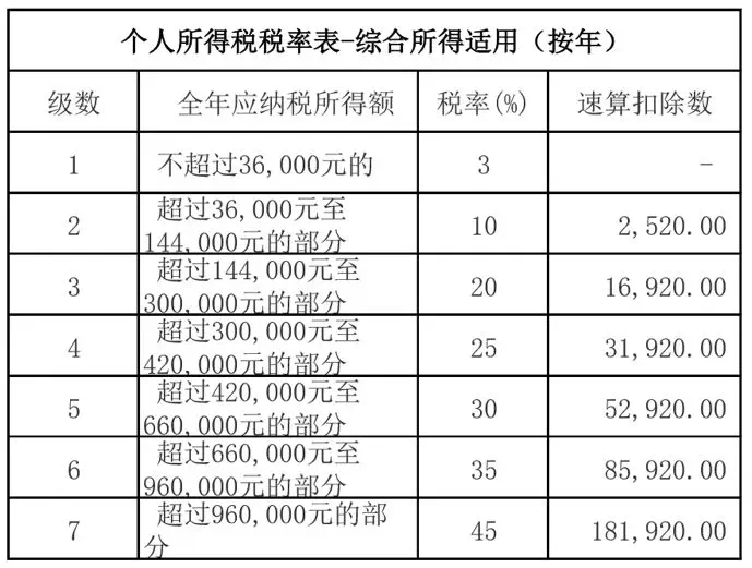 速算扣除数二: 工资薪金、劳务报酬、稿酬、特许权使用费综合所得适用(按年)
