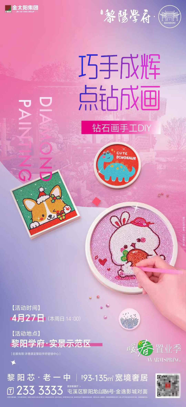 巧手成辉,点钻成画。黎阳学府钻石画手工DIY活动邀您共享美好时光。活动时间:4月27日(本周日14:00),活动地点:黎阳学府实景示范区。