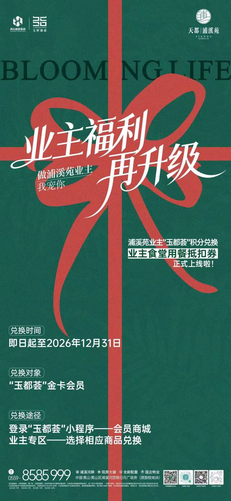 天都浦溪苑,业主福利再升级。浦溪苑业主"玉都荟"积分兑换业主食堂用餐抵扣券,正式上线啦!活动时间:即日起至2026年12月31日;兑换对象:"玉都荟"金卡会员;兑换途径:登录"玉都荟"小程序会员商城业主专区选择相应商品兑换。
