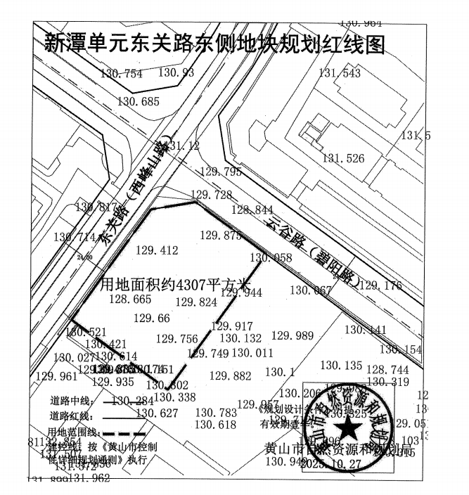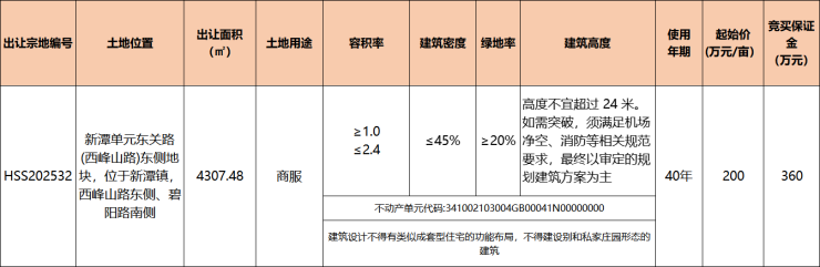 2025年11月14日,黄山中心城区新潭单元东关路(西峰山路)东侧地块挂牌(宗地编号:HSS202532),地块位于新潭镇,西峰山路东侧、碧阳路南侧,土地性质为商服用地。总出让面积4307.48㎡(合6.46亩),起始总价1292.244万元,起拍单价3000元/㎡(200万元/亩),起拍楼面地价1250元/㎡,容积率1.0≤R≤2.4。拍卖时间:2025年12月15日15时30分。建筑设计不得有类似成套型住宅的功能布局,不得建设别和私家庄园形态的建筑。