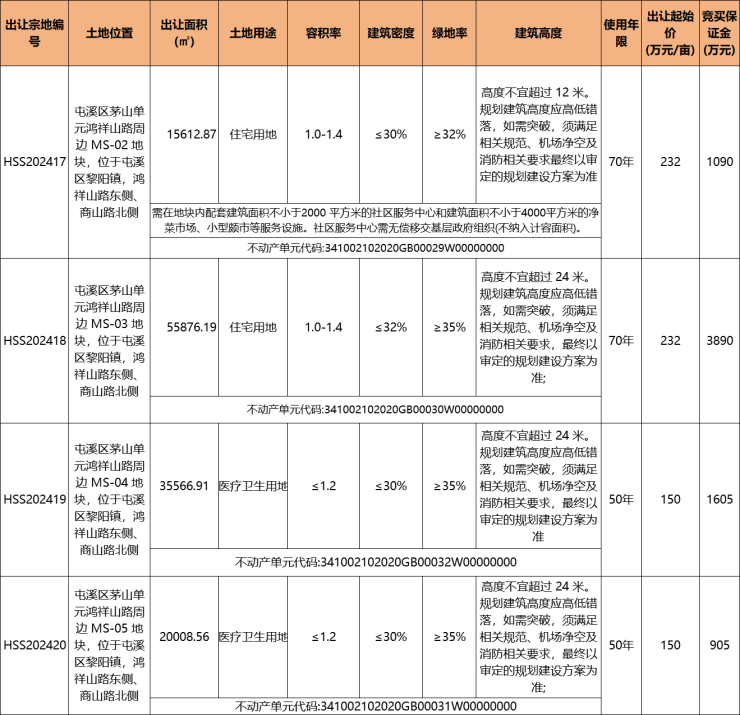 其中 MS-02 地块(宗地编号HSS202417号)住宅地块,位于屯溪区黎阳镇,鸿祥山路东侧、商山路北侧,出让面积15612.87平方米(合23.42亩),起始总价为5433.2788 万元,起始单价为3480.1元/平方米(合232 万元/亩),起拍楼面地价2485.78元/㎡,容积率为1.0-1.4 。
