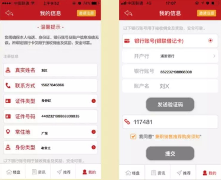 3、 完善个人资料后,添加银行卡信息,点击“发送验证码”。