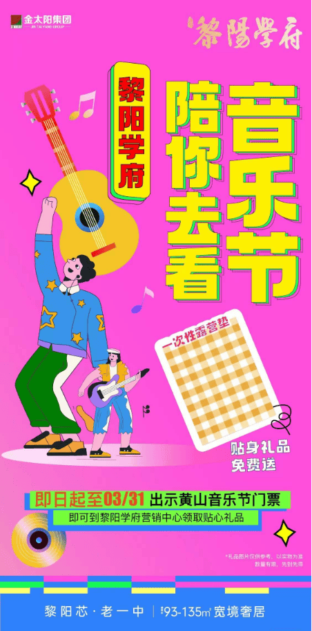 黎阳学府,焕新计划。陪你去音乐节,贴心礼物免费送!即日起至3月31日,出示黄山音乐节门票即可至黎阳学府营销中心免费领取一次性露营垫1张。黎阳学府,黎阳芯·老一中,建面约93-135㎡宽境奢居热销中,新品即将入…