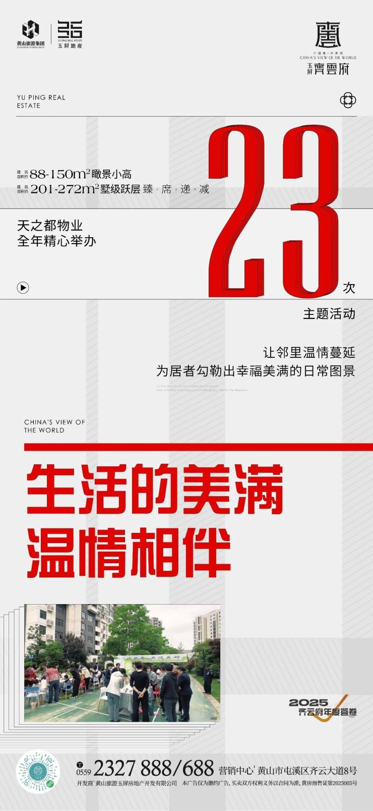 生活的美满,温情相伴。天之都物业全年精心举办23次主题活动,让邻里温情蔓延,为居者勾勒出幸福美满的日常图景。玉屏齐云府,6期实景现房,即买即享!建面约88-150m㎡瞰景小高、201-2721㎡墅级跃层,臻席…