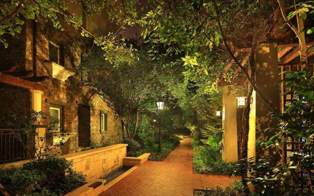 低垂的夜幕、踩着晚霞的光影、在楼下园子里