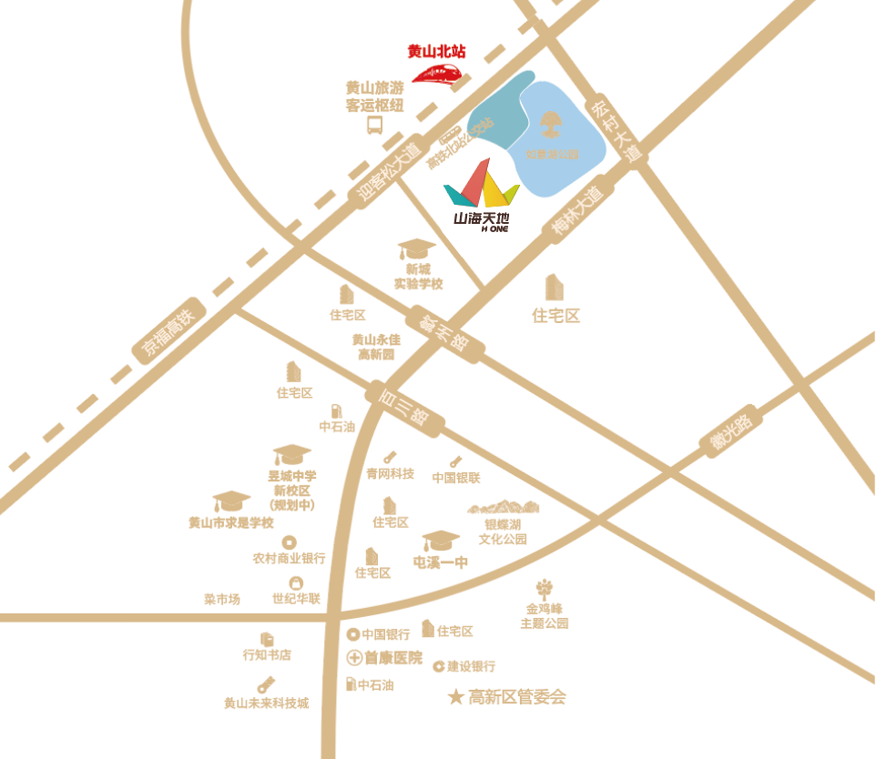 山海天地地处黄山高铁新城核心区, 毗邻皖南地区较大的综合交通枢纽——黄山高铁北站,领占黄山发展重要城市轴线,享受高新区带来的区域利好。