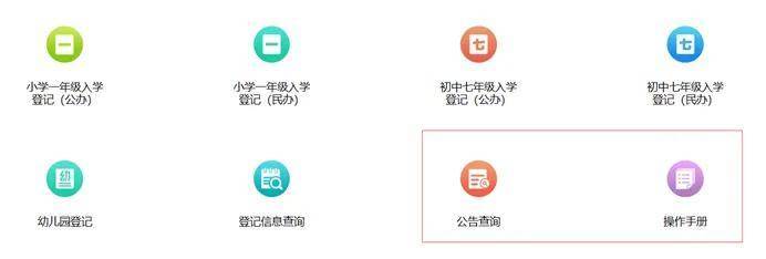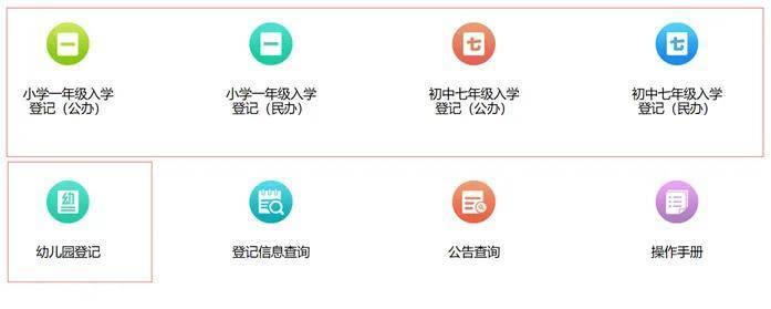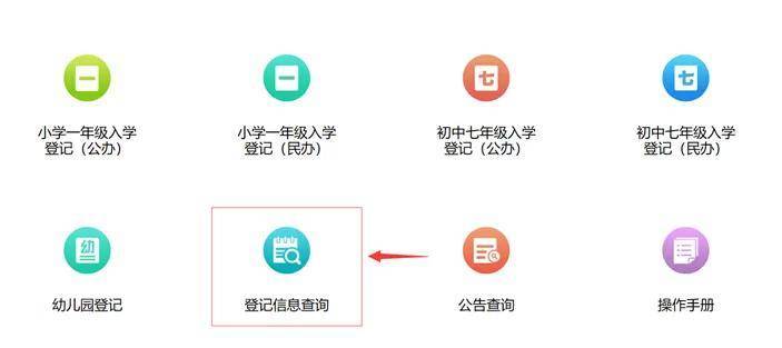 参加各阶段报名的家长按照图标指示进入报名入口界面,以“小学一年级新生入学登记(公办)”为例,选择“小学一年级新生入学登记(公办)”入口,进入报名入口列表。