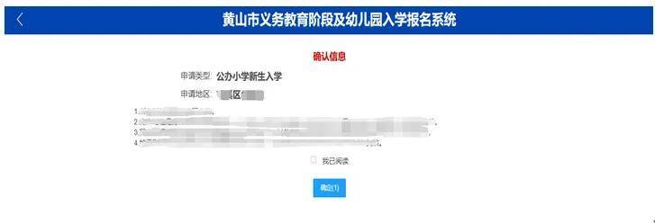 点击“XX区(县)公办小学一年级新生入学报名”,第一步“确认信息”。