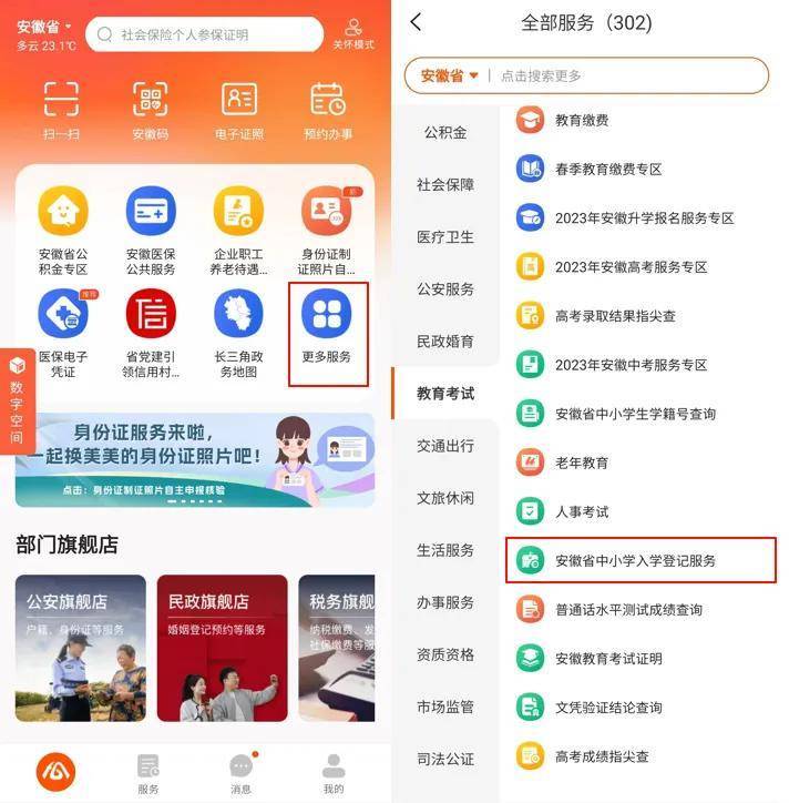 皖事通APP中进入中小学入学登记入口(“更多服务”->“教育考试”->“安徽省中小学入学登记服务”),在区域选择界面选择“黄山市”,或者直接搜索关键字“入学登记”后点击“安徽省中小学入学登记服务”,选择“黄山市”,进入皖事通报名页面。