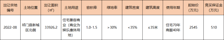 2022年8月3日,祁门县一中片区XCQ2-01-01地块(宗地编号:2022-08)成功出让,由黄山峰源生物科技有限公司底价竞得