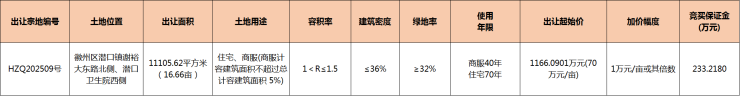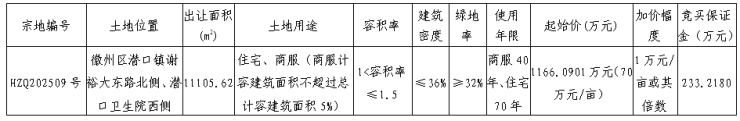 2025年5月30日,徽州区1宗商住用地(宗地编号:HZQ202509号)挂牌,宗地位于徽州区潜口镇谢裕大东路北侧、潜口卫生院西侧,总出让面积11105.62㎡(合约16.66亩),容积率1-1.5,起拍总价1166.0901万元,起拍单价1050元/㎡(70万元/亩),起拍楼面地价700元/㎡,拍卖时间:7月4日15时30分。