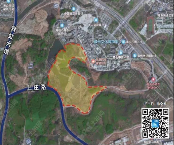 地块位于黄山现代服务业产业园文创小镇内,西侧为宾虹路,东、北为用地边界,南侧为上庄路。地块周边已开发建设有徽州文化博物馆、城市展示馆、图书馆、徽菜博物馆、昌仁医养综合体、依云红郡、惠仁心苑等公共服务配套设施和居住小区,周边市政基础设施完善。