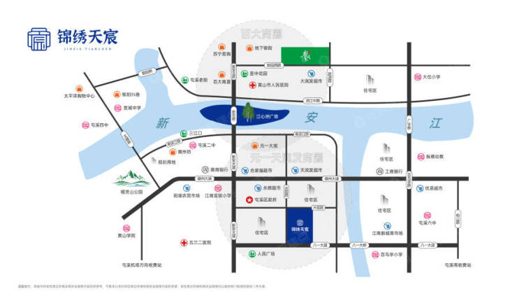 锦绣天宸地处整个江南板块的核心洽阳区域,经多年发展,区域配套已十分醇熟。八一大道、新安大道、徽州大道尽在咫尺,交通优势明显;天润发超市、江南菜市场、合家福超市环绕左右,生活氛围浓厚;更近享江南幼儿园、江南实验小学、百鸟亭小学、屯溪六中等优质教育资源。