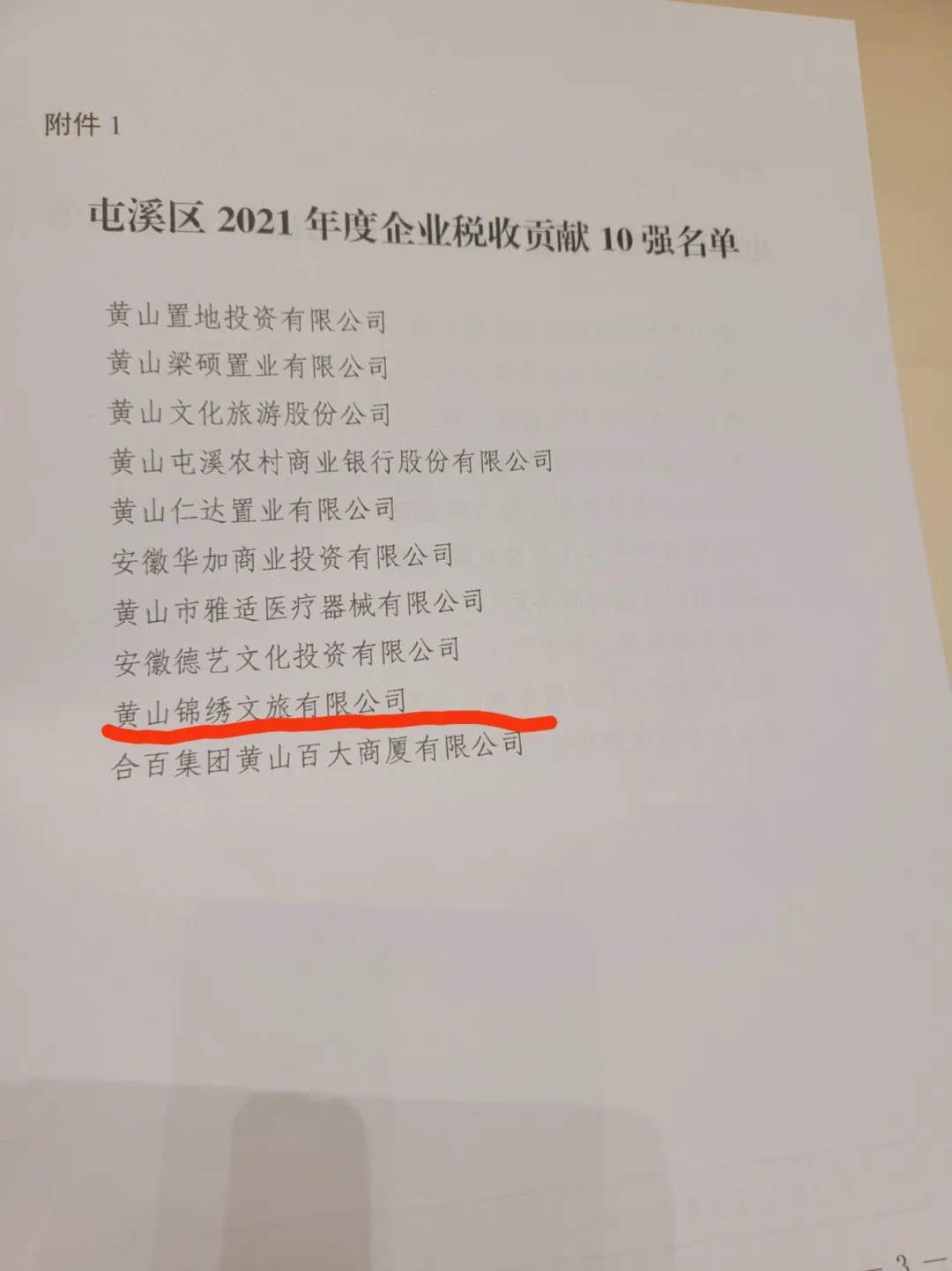 日前,中共屯溪区委、屯溪区人民政府评出屯溪区2021年度企业税收贡献10强企业,黄山锦绣文旅有限公司光荣上榜!