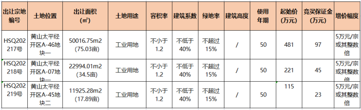 (五)竞得人自签订成交确认书5日内同黄山太平经济开发区管理委员会签订《开发区工业项目“标准地”投资建设协议》和《开发区工业项目“标准地”承诺书》,10个工作日内签订出让合同。受让人需保证HSQ202217号地块:1.该地块投资额不低于15000万元,2.投资强度不低于200万元/亩,3.亩均税收不低于15万元/年,4.单位工业增加值能耗不高于0.88吨标煤/万元,5.单位工业增加排放值排放按照《安徽黄山太平经开区区域节能报告》的要求执行,6.其他指标满足“三线一单”和经开区环评要求,严格落实环评、“三同时”和排污许可要求,7.投产时间为开工建设之日起2年内。HSQ202218号地块:1.该地块投资额不低于6900万元,2.投资强度不低于200万元/亩,3.亩均税收不低于15万元/年,4.单位工业增加值能耗不高于0.45吨标煤/万元,5.单位工业增加排放值排放按照《安徽黄山太平经开区区域节能报告》的要求执行,6.其他指标满足“三线一单”和经开区环评要求,严格落实环评、“三同时”和排污许可要求,7.投产时间为开工建设之日起2年内。HSQ202219号:1.该地块投资额不低于3580万元,2.投资强度不低于200万元/亩,3.亩均税收不低于15万元/年,4.单位工业增加值能耗不高于0.28吨标煤/万元,5.单位工业增加排放值排放按照《安徽黄山太平经开区区域节能报告》的要求执行,6.其他指标满足“三线一单”和经开区环评要求,严格落实环评、“三同时”和排污许可要求,7.投产时间为开工建设之日起2年内。