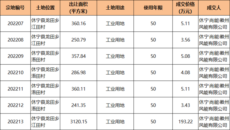 休宁县龙田乡7宗工业用地成交,由休宁尚能徽州风能有限公司竞得