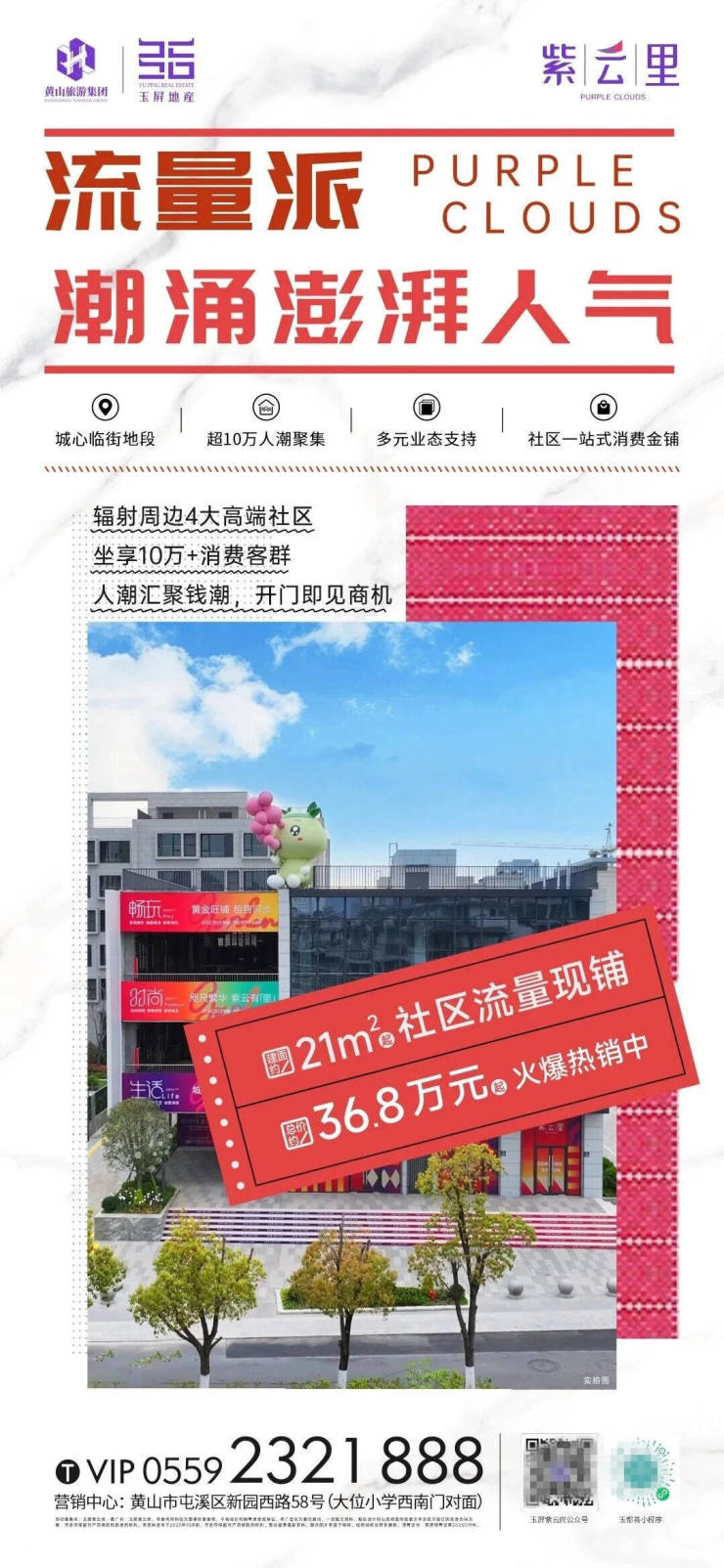 流量派,潮涌澎湃人气。玉屏紫云府辐射周边4大高端社区,坐享10万+消费客群,人潮汇聚钱潮,开门即见商机。建面约21㎡社区流量现铺,总价36.8万元起,火爆热销中。